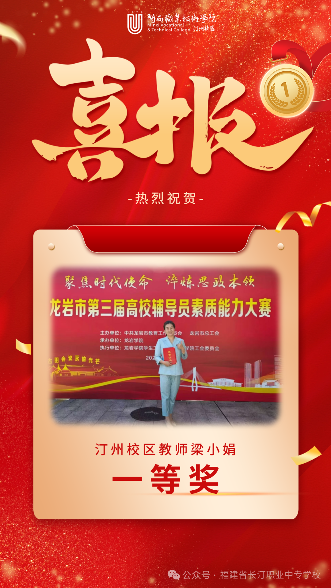 冬日暖阳映初心,赛场竞技展锋芒。12月1日至2日,龙岩市第三届高校辅导员素质能力大赛在激烈角逐中圆满落幕。闽西职业技术学院汀州校区的梁小娟老师凭借扎实的专业素养、灵活的应变能力与深厚的育人情怀,一路过关斩将、脱颖而出,最终斩获一等奖的优异成绩,为校区赢得了荣誉。