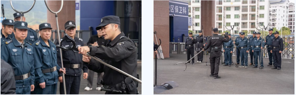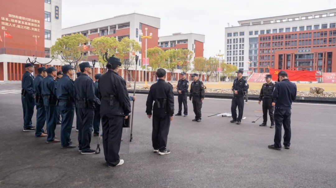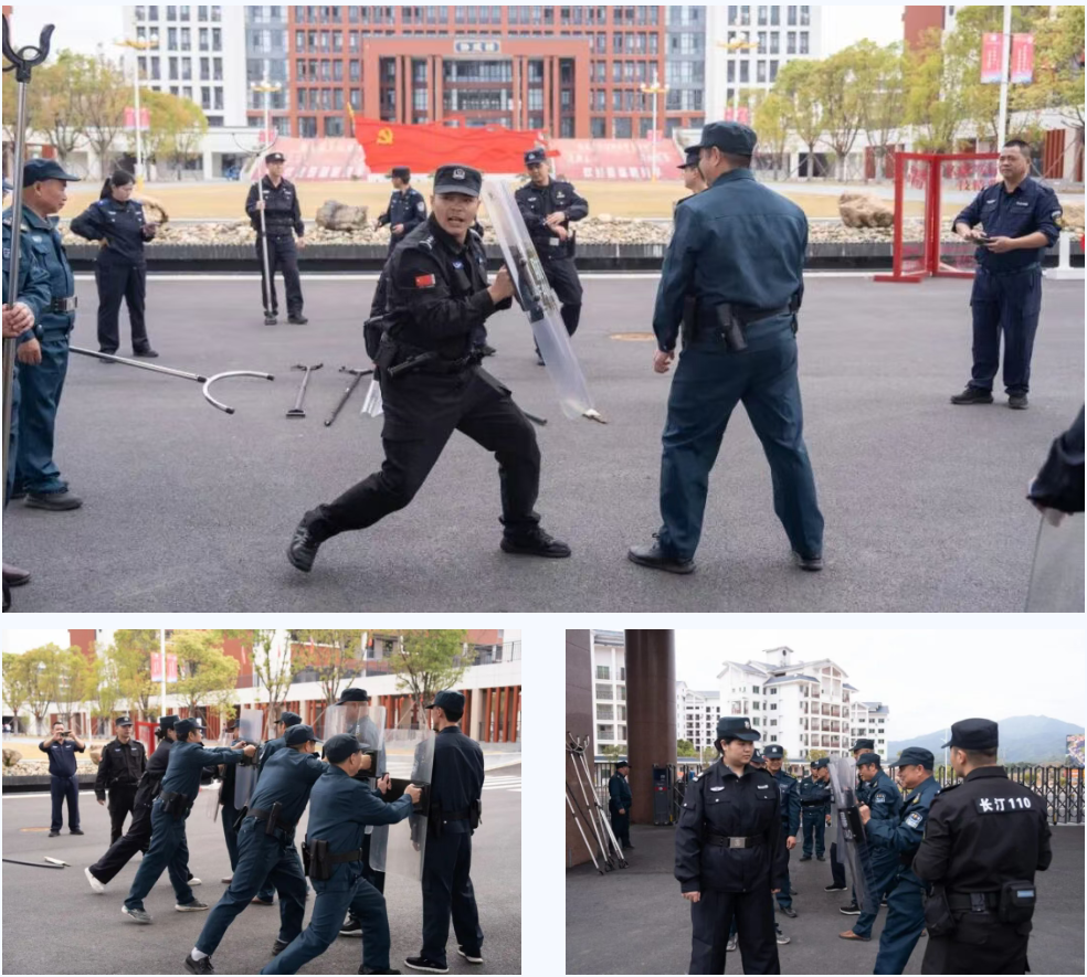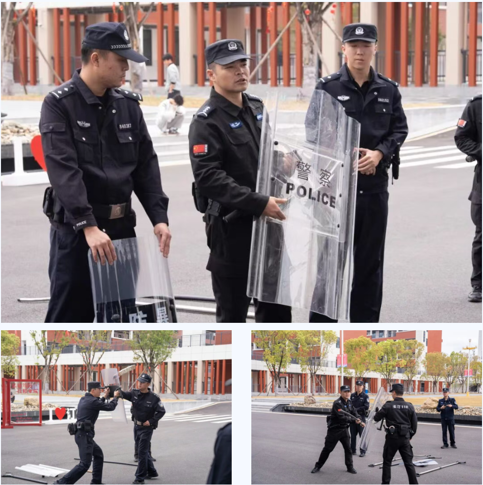 随后进入实战演练环节。在巡特警大队民警的专业指导下,现场模拟外来人员强行闯入校园滋事场景。应急单元成员迅速响应、分工协作:警戒组快速划定警戒区域、疏散周边师生;处置组身着防护装备,运用防暴盾牌、钢叉等器材规范配合,迅速控制滋事人员;救护组同步开展伤员急救处置;通讯组及时联络并上报情况。整个演练过程紧张有序,人员响应迅速、配合默契,展现出良好的应急联动水平。