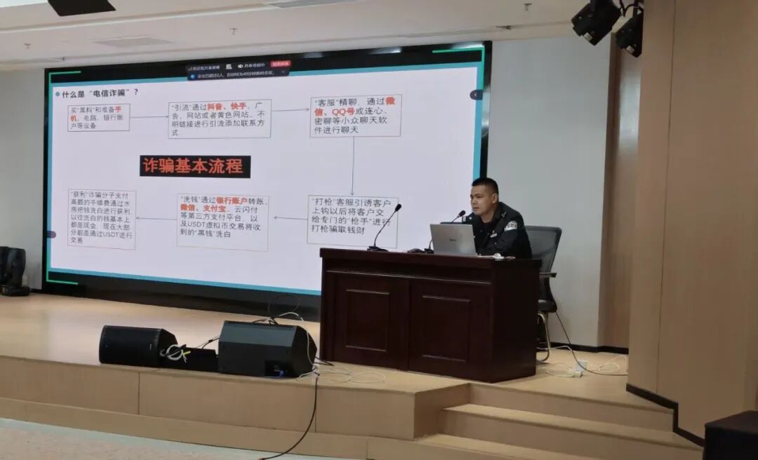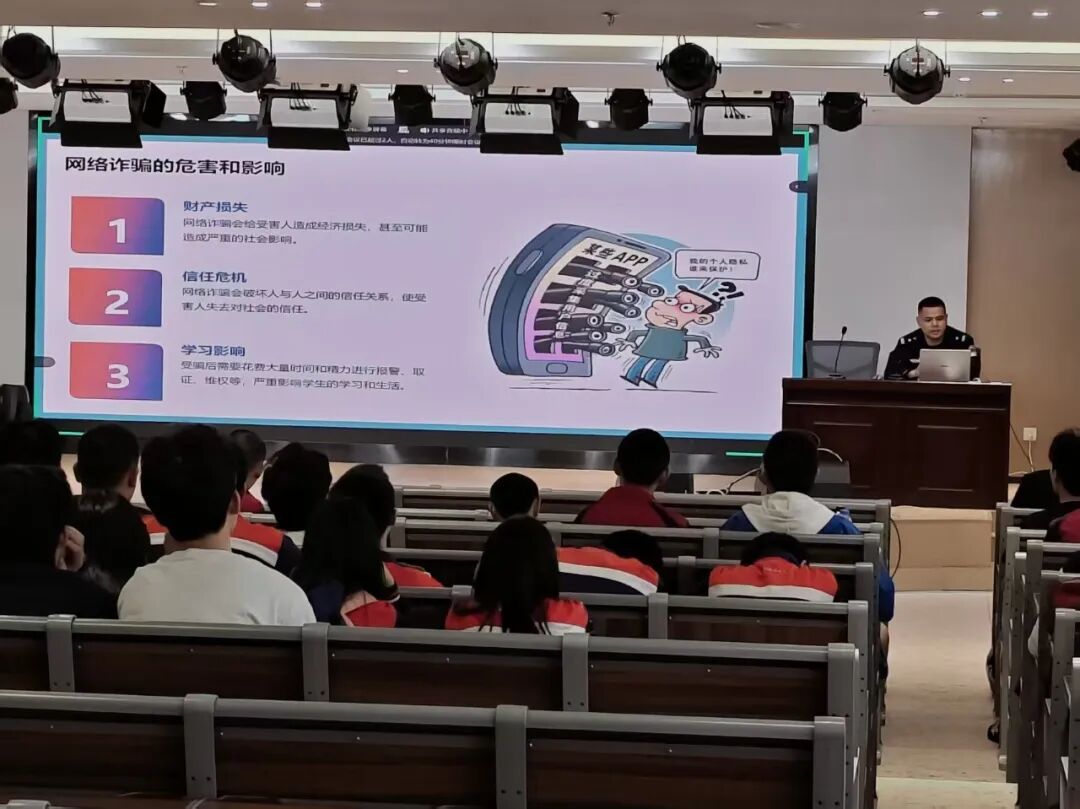 讲座中,涂奎英警官结合当前电信网络诈骗犯罪的新形势、新特点,聚焦学生群体易遭遇的网络游戏交易诈骗、兼职刷单诈骗、冒充熟人及老师诈骗、虚假中奖诈骗等高发类型,通过剖析真实典型案例、拆解诈骗分子作案手法、讲解诈骗话术套路等方式,向师生们普及电信网络诈骗的危害性与防范要点。