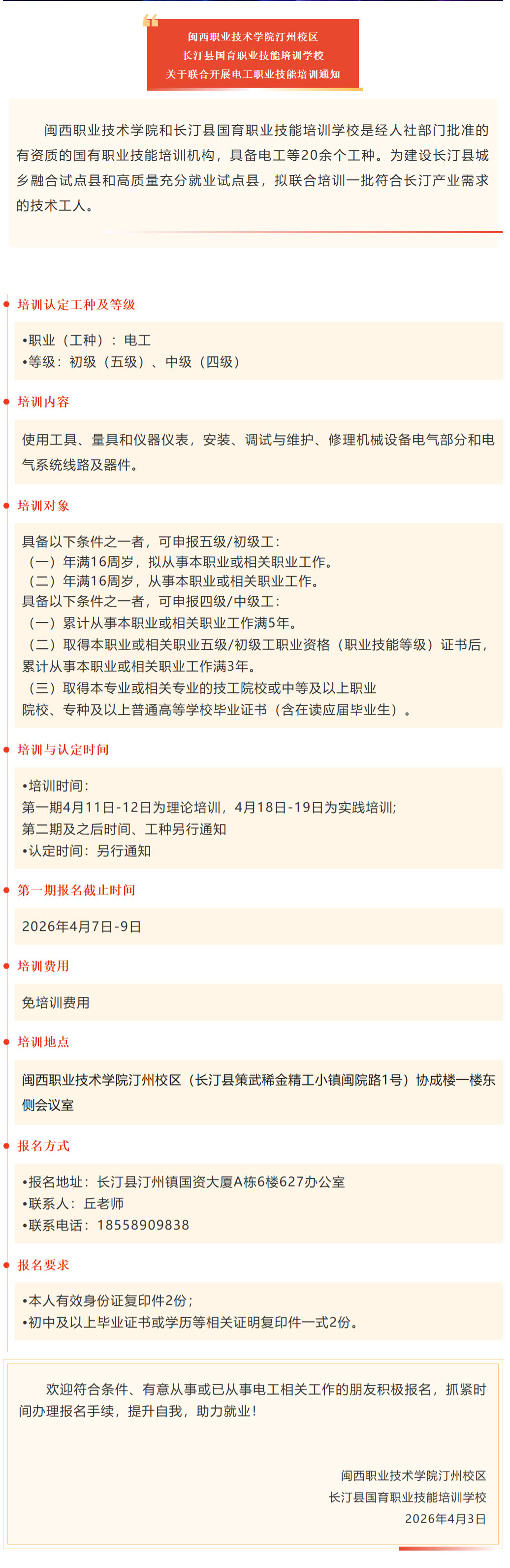 闽西职业技术学院汀州校区、长汀县国育职业技能培训学校关于联合开展电工职业技能培训通知