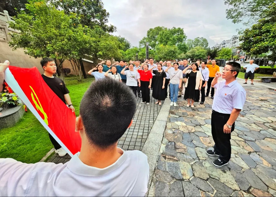在瞿秋白纪念馆前,学校党委书记、校长肖贞祥带领全体党员面对鲜红的党旗一起高举右手,再次重温入党誓词。