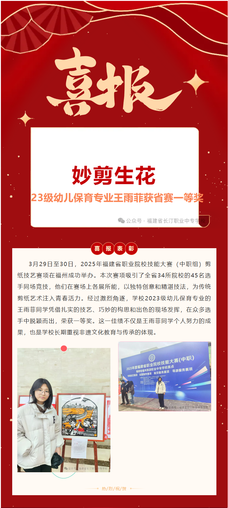 喜报|妙剪生花——长汀职专2023级幼儿保育专业王雨菲同学获省赛一等奖