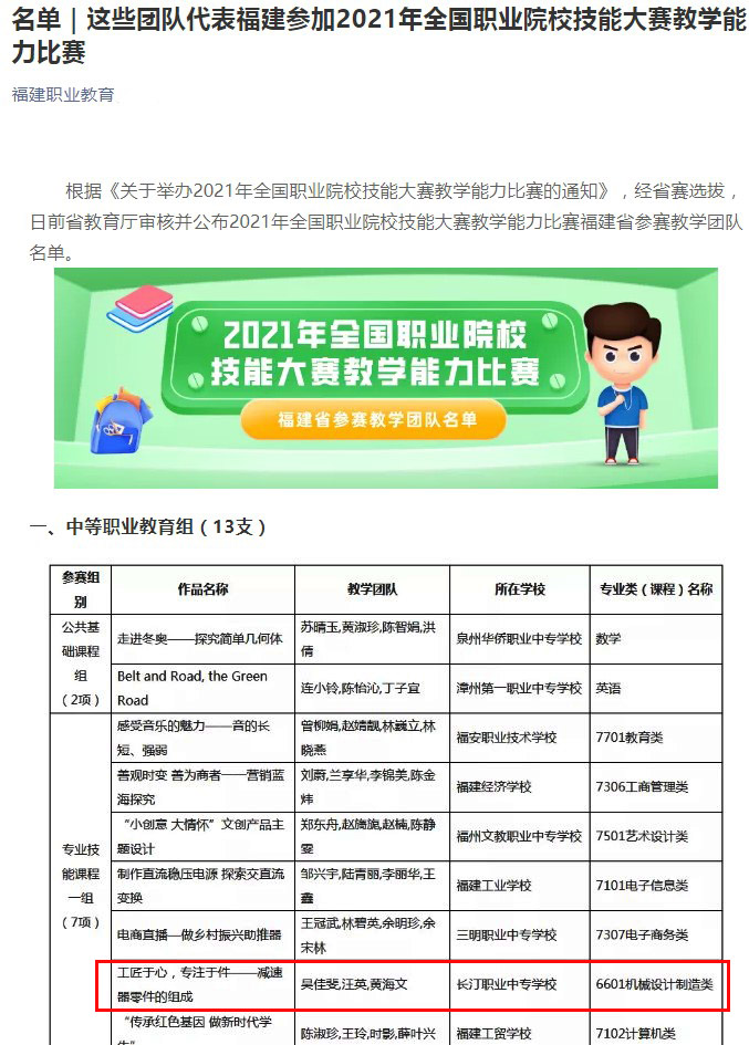 全国职业院校技能大赛教学能力比赛竞争异常激烈,我校自去年10月份启动校赛以来,学校领导高度重视,组织教师积极参与,认真备赛,经过县、市、省选拔,再经过答辩、培训,我校吴佳斐、汪英、黄海文教学团队报送的作品《工匠于心、专注于件—减速器零件的组成》成功晋级2021年全国职业院校技能大赛教学能力决赛。