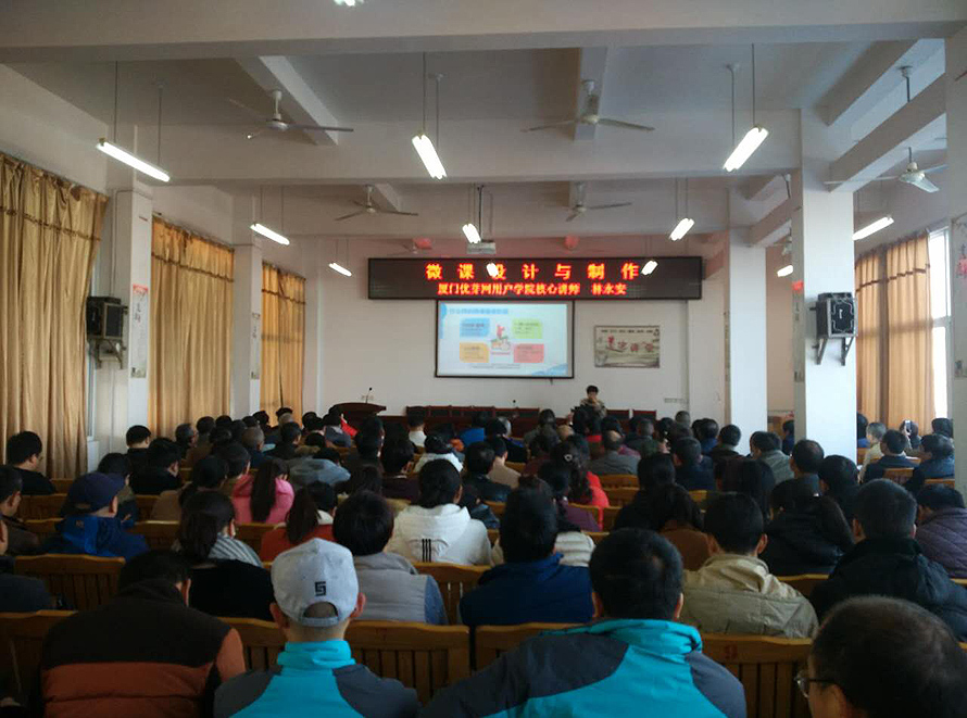 2017年2月12日上午,我校邀请厦门优芽网用户学院部核心讲师林永安老师进行微课设计与制作培训。通过本次培训,老师对微课的概念及特征,选题技巧,微课的设计与制作,播放讲解、剪辑制作等有更深层次的认识。