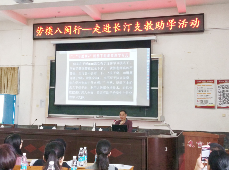 2016年11月14日上午,我校15位年轻教师到长汀四中参加“劳模八闽行----走进长汀支教助学活动”,在阶梯教室倾听了省劳模叶东福(特级教师)的聚焦“互联网+”时代课堂教学讲座。本次学习的主要内容有:1、对“互联网+教育”的理解。2、“互联网+”时代下的课堂教学方式。3、"互联网+“研讨会现场课实录。4、“互联网+”的实践体会。5、''互联网+教育"的一些基本技能。6、"互联网+"的教学设计研究。7、“互联网+”的教学总结。