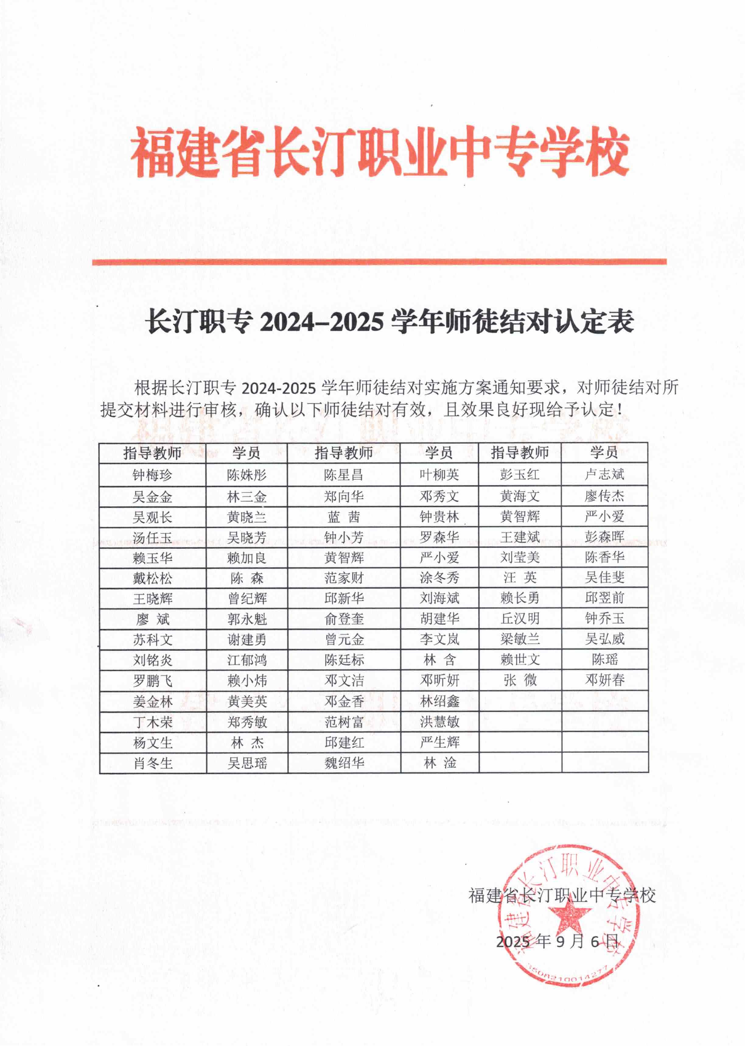 长汀职专 2024-2025 学年师徒结对认定表