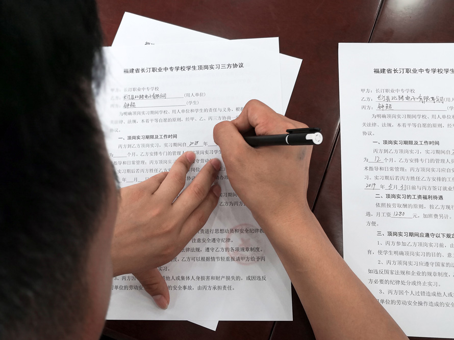 5月28日下午,长汀比路电子有限公司专场招聘会在学校教工会议室举行。本次招聘会议吸引了电子、数控、计算机、汽车维修、财会等专业一百多名同学到场咨询、应聘。近五十名同学经过面对面洽谈确定了就业意向,并现场签订了顶岗实习三方协议书。