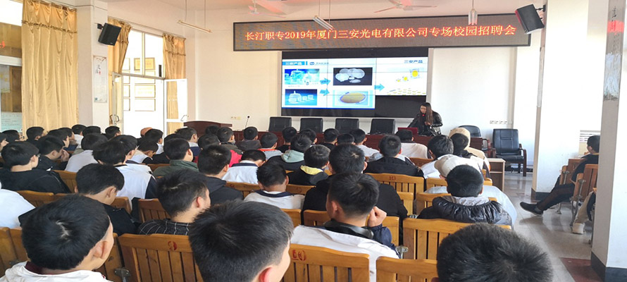 12月6日上午,厦门三安光电有限公司到我校进行了一场校园专场招聘会,17级电子、数控、计算机、财会四个专业230多位学生参加了此次招聘会,会上该公司招聘负责人小林对厦门三安光电有限公司作了详细的介绍,公司成立于 2000年11月,主要从事全色系LED芯片、植物照明(中科院重点规划项目)等重点高科技产品,是上市企业,2018年在泉州新投资333亿,设立新厂房,所以急需大量各级岗位人才,希望同学们不要错失良机,同学们对高科技的工厂也抱有极大的兴趣,表现出了极大的热情,当场签订就业意向50多人。这是我校第一次与厦门三安合作,希望通过此次的合作,后续我们有更多的学生加入他们。
