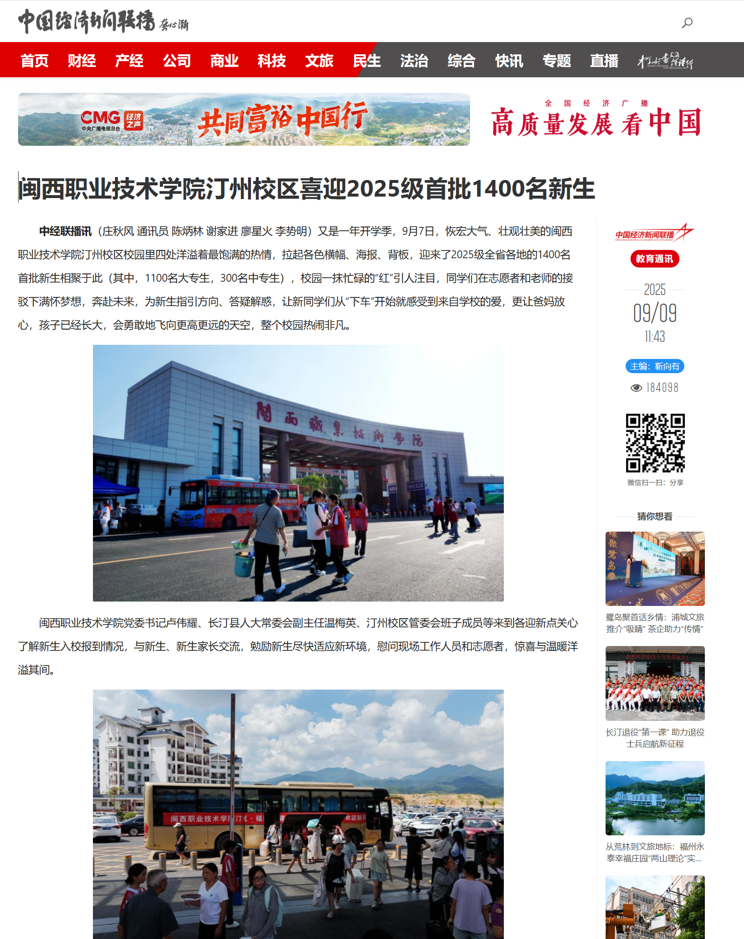 【中国经济新闻联播】闽西职业技术学院汀州校区喜迎2025级首批1400名新生