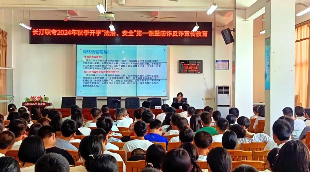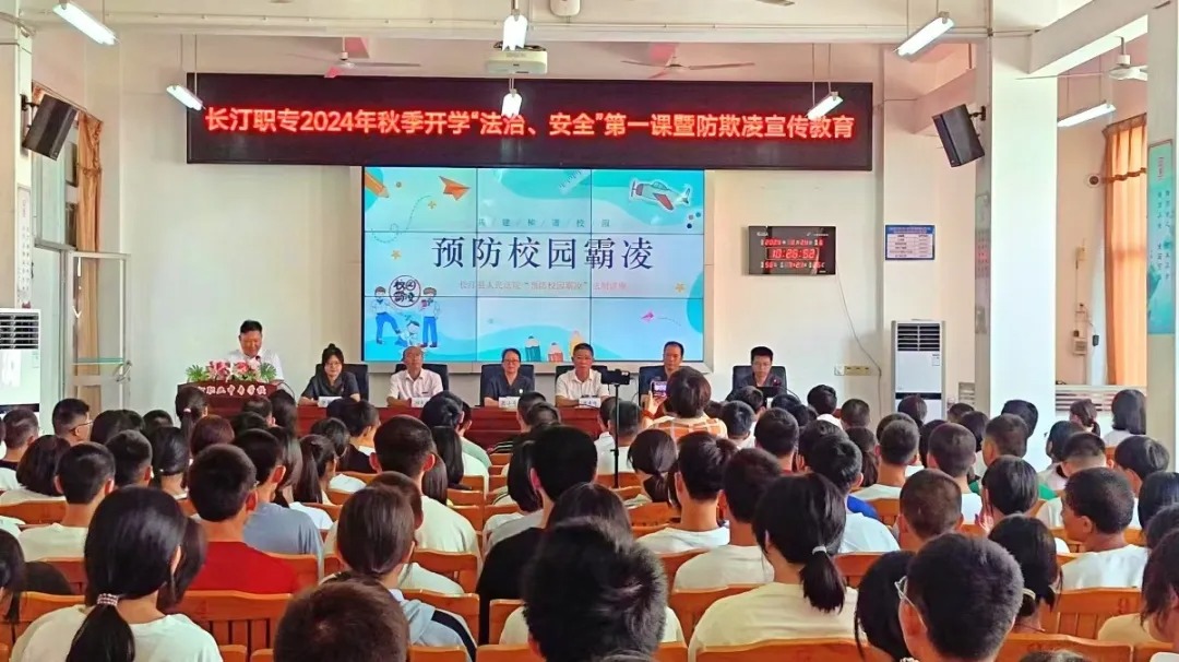 为进一步加强校园法治建设,提高同学们的法律意识与自我保护能力。近日,长汀县人民法院党组成员、副院长段小华及审委会委员、刑庭庭长黄田火一行走进学校为全校新生上了一堂生动的开学第一课暨预防校园欺凌和防诈反诈法治教育讲座。