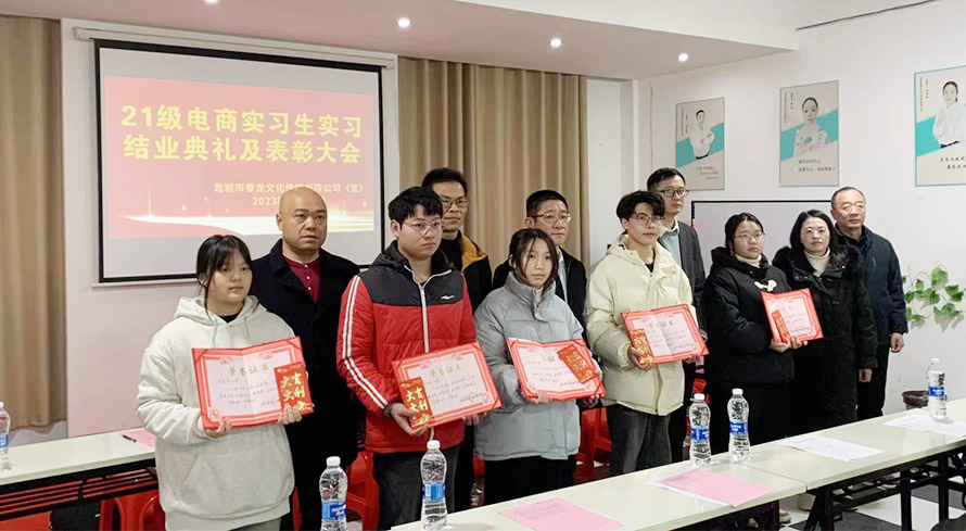 12月23日上午,学校2021级电商班实习结业典礼暨现代学徒制表彰大会在龙岩市豢龙文化有限公司隆重举行。学校党委书记、校长肖贞祥,副校长刘铭永,龙岩市豢龙文化有限公司总经理俞宜林及2021级电子商务专业学生等出席了结业典礼。