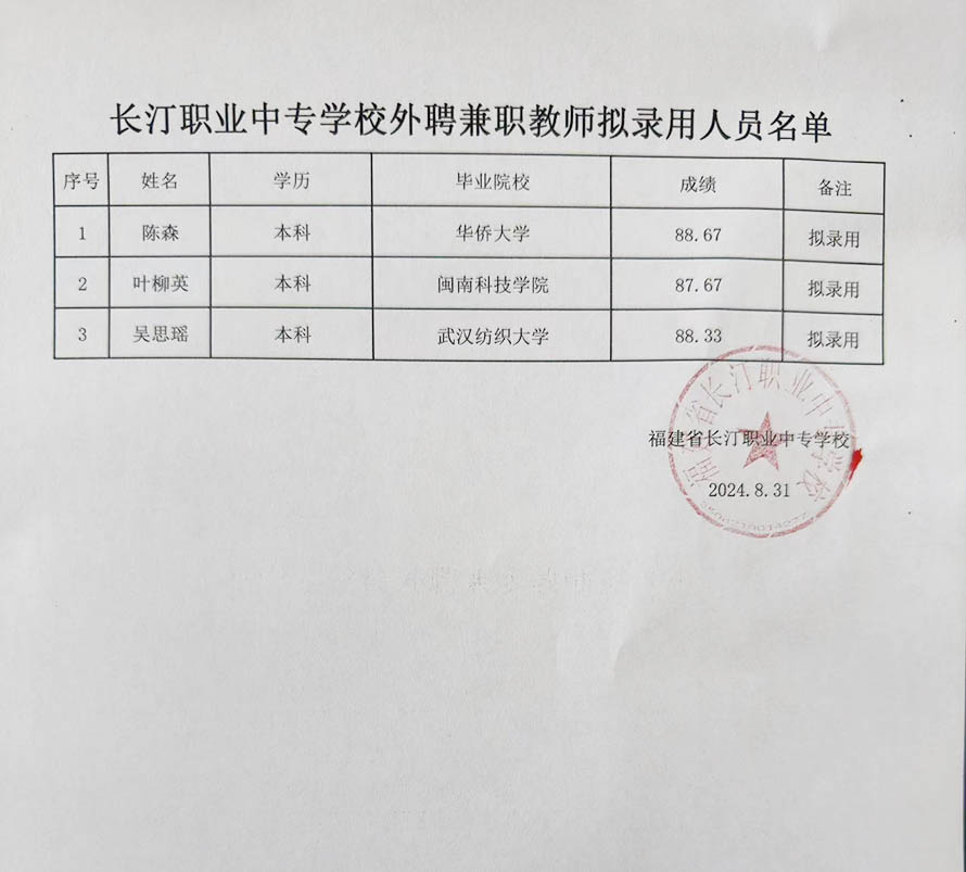 长汀职业中专学校外聘兼职教师拟录用人员名单