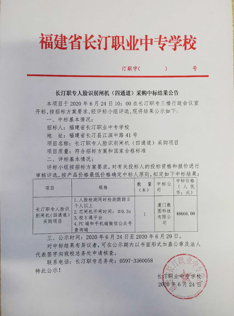 长汀职专人脸识别闸机(四通道)采购中标结果公告