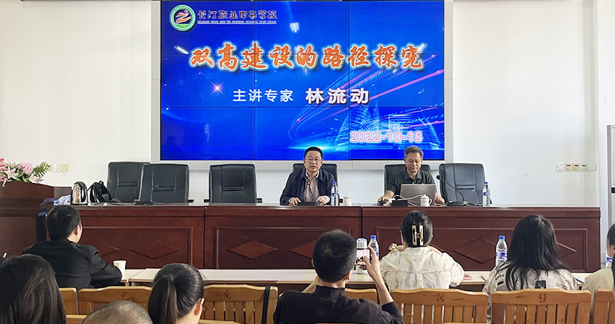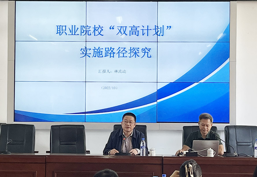 2022年10月15日上午,厦门海洋职业技术学院林流动研究员来我校,在二楼教工会议室作了题为《双高建设实施路径探究》的专题报告。我校双高建设全体参建人员参加了此次报告会。党支部书记、校长赖友生主持报告会。