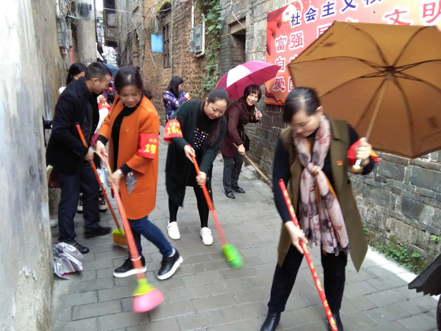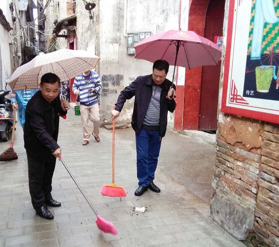 我校党员教师冒着风雨,穿着雨衣,一手扫帚、一手垃圾袋,专心致志地清扫垃圾、杂草,连一片纸屑、一颗烟头都不放过,并将它们统一清理到清洁车上。借着雨水的洗涮,整个水东街巷焕然一新。