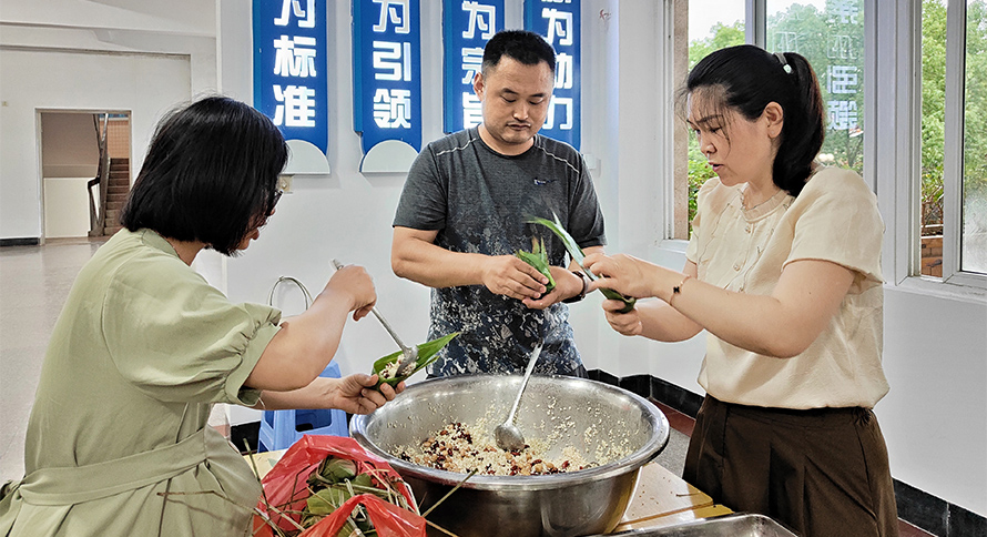 活动中,大家互帮互学、分工合作,捋粽叶、填糯米、加肉馅、封口扎捆……教职工们,有的技术娴熟,包出的粽子有棱有角;有的新手上路,包出的粽子造型独特。整个活动现场忙而不乱、欢声笑语,呈现出一派和谐轻松的气氛。
