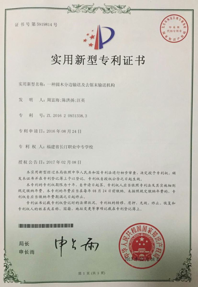 我校与福建得力机电有限公司共建校企技术研发中心,组建技术服务团队参与公司技术研发,该公司工程师周富海与我校专业骨干教师陈洪扬、 汪英等共同参与研发新产品(一种圆木分边输送及去锯末输送机构),该新型实用产品能够实现圆木边料和圆木体分离传输,同时能够将分离后的锯末送至刮料机构进行刮料,属于输送带技术创新领域。该产品于2017年2月获国家知识产权局专利授权,专利号:ZL201620931338.3