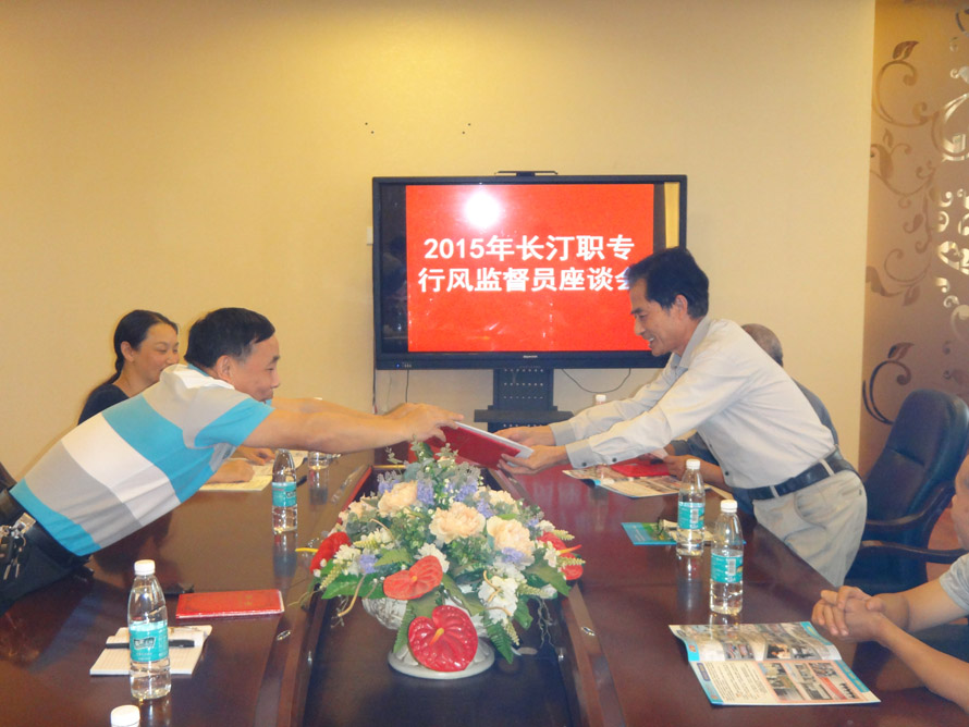 党支部书记兰福荣同志向各位行风监督员详细介绍了我校近几年行风建设工作情况。一是积极作为,学校从招生、示范校建设工作中积极投入,使我校真正成为一所辐射全县的中职学校;二是坚定不移,重点抓好绩效工资的管理、学校教学工作、校容校貌、制度落实等工作;三是夯实基础,加大教学巡查力度,校务公开制度,使日常管理工作更加规范;四是鼓劲加压,教师队伍建设得到加强。随后,钟瑜主席宣读了长汀职专聘请行风监督员的决定,兰福荣书记为曹清华等五位新聘请的行风监督员颁发了证书。
