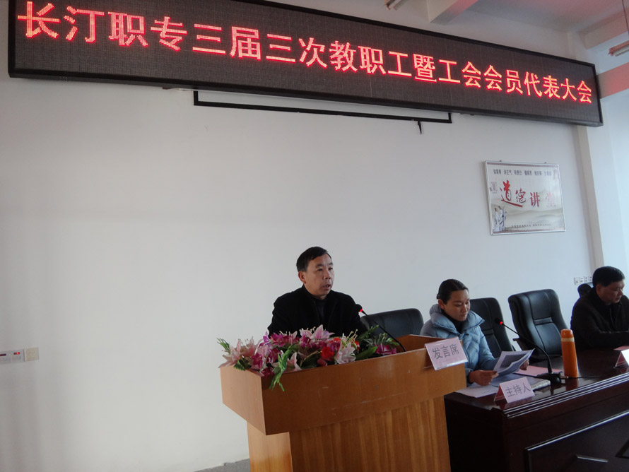 在学校党委领导下,经过学校工会的精心准备,2015年2月6日上午,长汀职专三届三次教代会在教工会议室隆重召开。